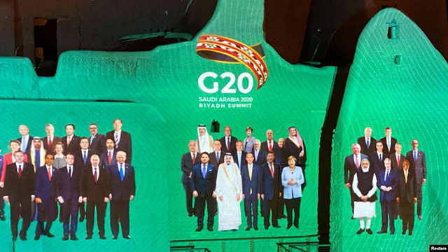 G20网路峰会的合照投射在东道国沙特阿拉伯的萨尔瓦宫墙壁上。2020年11月20日图片。 20国集团峰会网络会议周日(11月22日)于沙特阿拉伯继续进行第二天的议程。 ... |