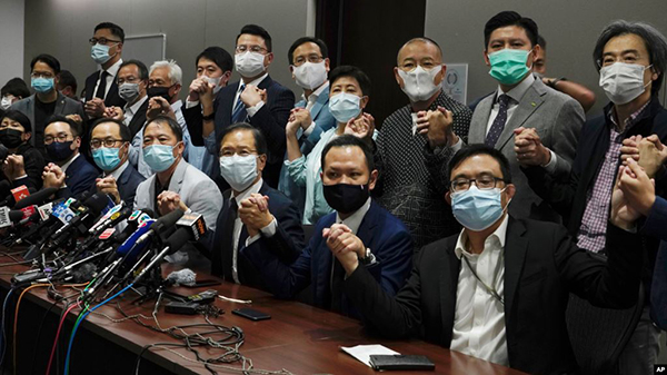 香港民主派议员在立法会举行新闻发布会之前拍照。2020年11月11日 香港政府星期三(11月11日)根据北京的有关规定取消了四名民主派议员的资格。此举引发立法会15名泛民主派议员集体辞职。... |