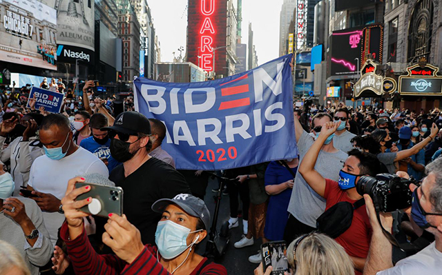 11月7日,人们聚集在美国纽约时报广场庆祝拜登和贺锦丽胜选。(图片来源:中新社) 如果拜登入主白宫,虽然说美中双方的贸易紧张局势不会缓和,但是将更具可预测性,这就意味着双方会采... |