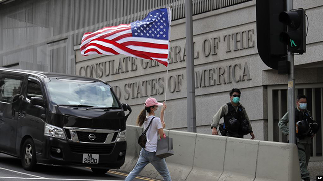 资料照片:在美国驻港澳总领事馆外的一次抗议活动中一名抗议者举着一面美国国旗过马路。(2020年7月4日) 美国国务卿蓬佩奥星期一(11月9日)发表声明,再指定四名北京和香港官员为制裁... |