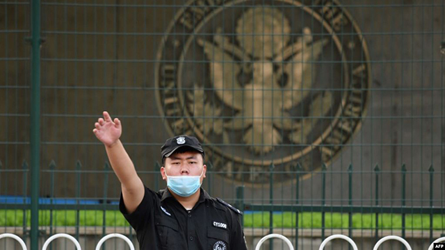 美国驻北京大使馆外的一名中国保安在做手势。(2020年9月12日) 美国驻中国大使馆周三(11月3日)对北京就中国驻美记者签证延期申请可能被拒发出的威胁作出反应,称中方的言论是“不可接... |