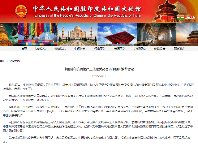 据中国驻印度共和国大使馆网站消息,10月27日,中国驻印度使馆发表严正声明,对美国国务卿蓬佩奥、防长埃斯珀在赴印出席印美“2+2”部长级对话会期间公然攻击中国和中国共产党予以严辞... |