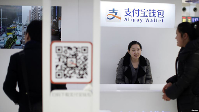资料照片:上海火车站里的一名销售助理与支付宝标识。(2015年2月9日) 彭博社周三(10月7日)报道说,美国政府因担心中国的蚂蚁集团和腾讯控股有限公司的数字支付平台威胁美国家安全而正在考... |