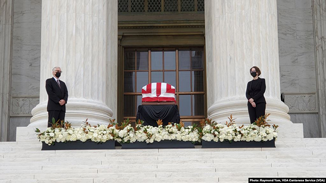 美国最高法院大法官金斯伯格的灵柩继续在星期四(9月24日)安放在最高法院正门外供人瞻仰(美国之音/任敬扬) 上周五去世的最高法院大法官鲁思·拜德·金斯伯格的灵柩正摆放于最高法院的... |