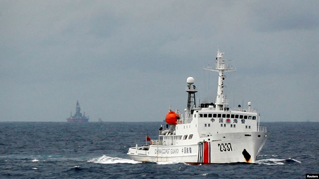 资料照:一艘中国海警船在南中国海上的一座中国海上钻井平台旁驶过。(2014年6月13日) 美国政府高官周三(8月26)表示,对中国公司和个人的制裁体现了美国对中国把南中国海军事化的强烈... |