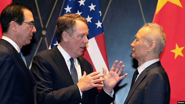 资料照:美国贸易代表莱特希泽(中)和财政部长姆努钦在上海与中国副总理刘鹤交谈。( 2019年7月31日) 美中高级贸易官员周二重申对第一阶段贸易协议的承诺。虽然这项协议的执行进度大大... |