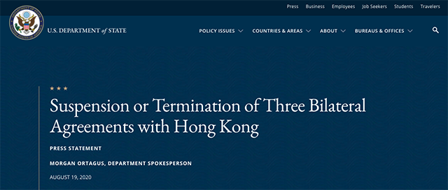 美国国务院宣布终止与香港移交逃犯等协议 |