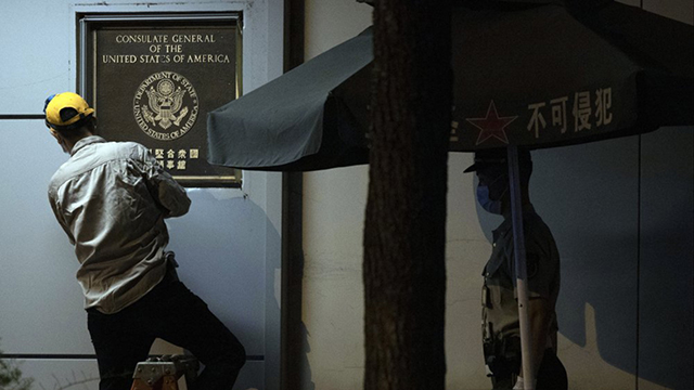 7月26日,中国西南部的四川省,一名工人正在从美国驻成都领事馆外移除牌匾。(图片来源:美联社) 周四(7月30日),崔天凯在POLITICO发表一篇名为《中美两国应重建关系》的评论文章,全... |