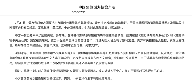 中国驻美国大使馆就美要求休斯敦领馆关闭发声明 |