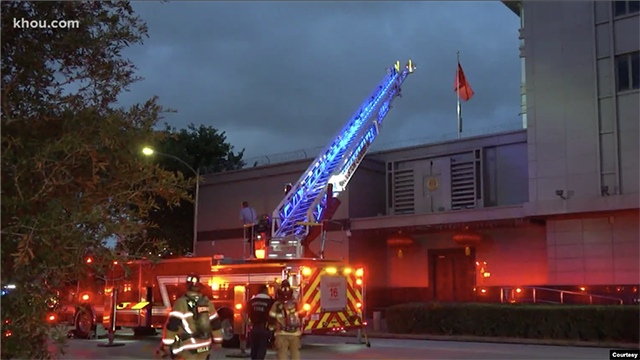 休斯顿消防人员2020年7月21日晚抵达中国总领事馆门外(KHOU电视台画面截图) 中国驻美国休斯顿总领事馆星期二晚上发生火警,当地消防人员到场救火,但未能进入大院。当时领馆人员在大院... |