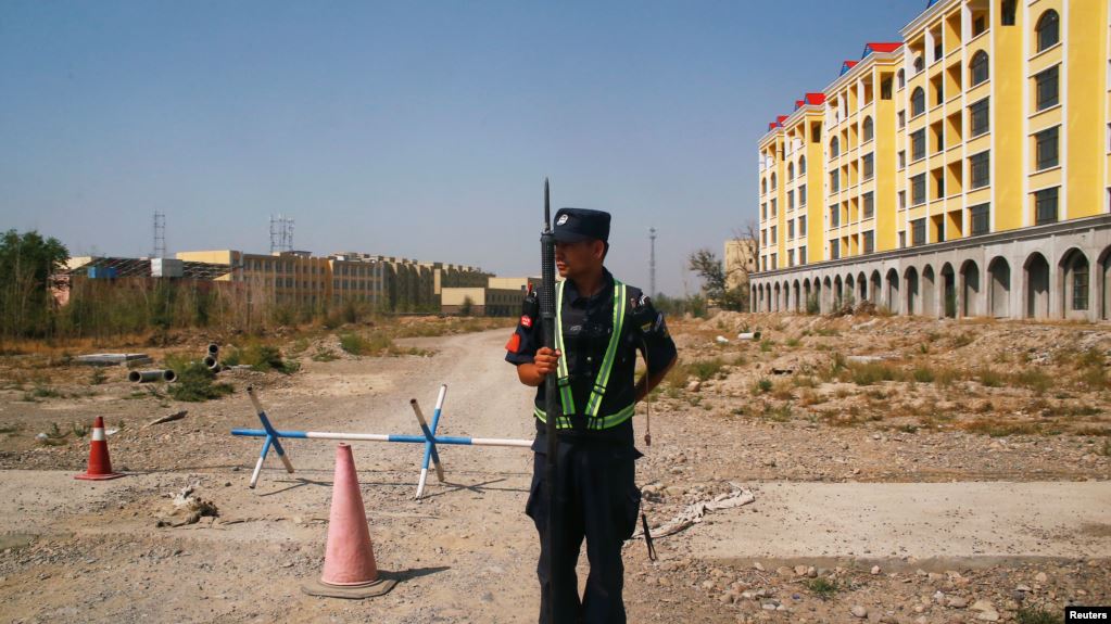 资料照片:中国警察在新疆伊宁一处官方所说的职业教培中心附近的路口站岗。(2018年9月4日) 美国商务部星期一(7月20日)把与新疆侵犯人权有关的11家中国公司加入到被制裁的实体清单中... |