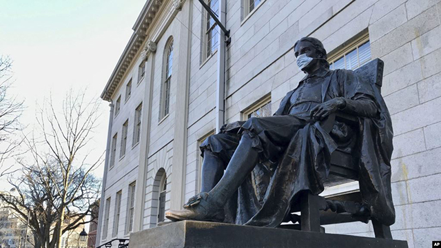哈佛大学一座地标雕塑,疫情之下有人为它也戴上了口罩。(2020年3月14日) 美国高教界人士强烈反对美国移民执法机构新颁布的国际学生签证政策,称新签证政策不仅可能威胁美国500亿美元的... |