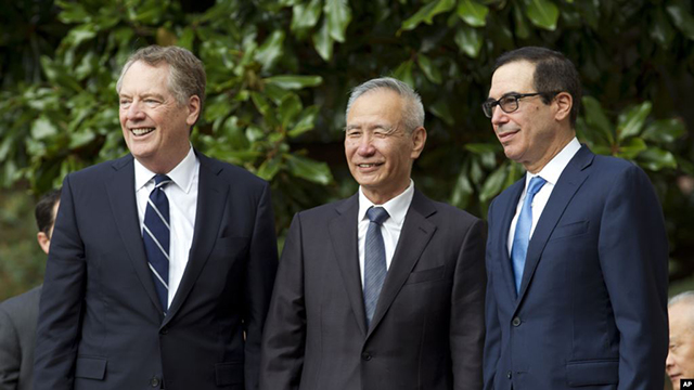 2019年10月10日美国贸易代表莱特希泽(左),中国副总理刘鹤(中),美国财政部长姆努钦(右)在美国贸易代表处前面合影。 贸易战和新冠病毒疫情或许加快了华盛顿和北京的脱钩,其他西方... |