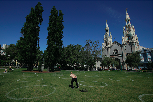 2020年5月23日,旧金山圣彼得和保罗教堂前的华盛顿广场公园,一名男子在进行锻炼。(美联社图) 加州官员周一宣布,加州将允许教堂在减少人流量的前提下开放,并允许零售商开放店内购物服... |