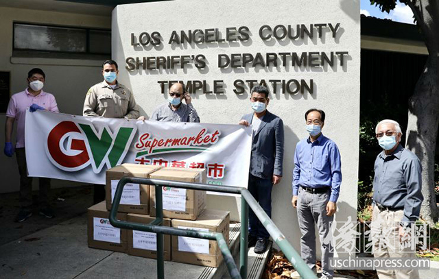 美侨联与大中华的代表联手在洛杉矶县警局天普市分局捐赠口罩。侨报记者邱晨摄 5月19日,美国洛杉矶华人华侨联谊会暨大中华超市为支持一线抗疫警员及医护人员的工作,防止他们受到新冠病... |