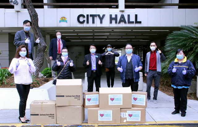 4月13日,美国加利福尼亚州西科汶纳华人协会会长、美国鹰龙传媒董事长苏彦韬(右三)和西科汶纳华人协会副会长苏林淑婷等来到西科汶纳市政府,捐赠10000个口罩和消毒液等医疗物资。(图片来源:中新社) ... |