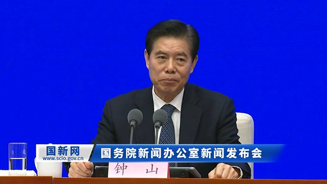 发布会现场。截屏图 5月18日,中国国新办举行稳住外贸外资基本盘推动商务高质量发展发布会,中国商务部部长钟山指出,全球疫情蔓延,国际市场需求大幅下降,中国今年对外贸易面临的挑战... |