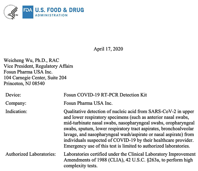 复星医药的新冠产品获美国FDA紧急使用授权 |