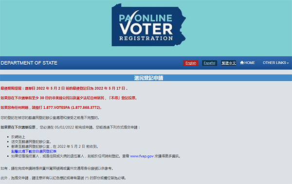 中期选举临近 宾州首推中文在线选民服务 |