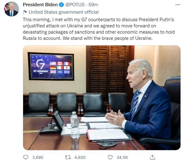 当地时间24日,美国总统拜登在社交媒体发文表示,在与七国集团(G7)领导人进行会晤后,他们一致同意对俄罗斯采取“毁灭性”的制裁,“以让俄罗斯承担责任”。 |