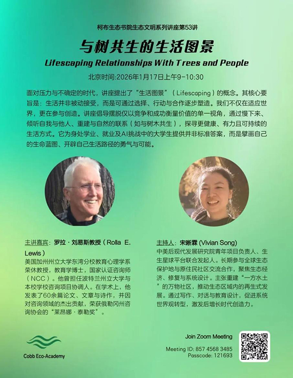 北京时间 2026 年 1 月 17 日上午,冬日的暖阳虽未驱散寒意,柯布生态书院内却涌动着思想的热流。柯布生态书院主办的生态文明系列讲座第 53讲“与树共生的生活图景”由来自美国加州州立... |