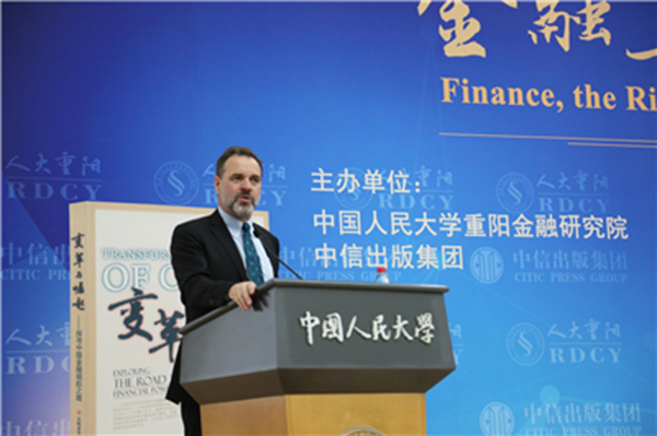 4月27日,由中国人民大学重阳金融研究院与中信出版集团共同主办的第33期重阳论坛在人民大学举行,论坛邀请了英国著名历史学家尼尔·弗格森(Niall Ferguson)与中国人民大学副校长、中国金融学家吴晓求,就“金融与大国兴衰”、基辛格与中美建交、两国关系的过往与发展,以及特朗普时代下“中美国(Chimerica)”结构、传统文明与金融发展、金融体系与国际不平等、人民币国际化等话题进行讨论。此次论坛由中国人民大学重阳金融研究院执行院长王文主持。