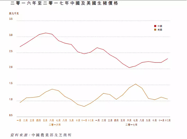 数据显示,2016年、2017年,美国猪肉价格始终在每千克1.0美元和1.5美元之间,而中国猪肉价格最高突破3美元,最低也不低于2美元。
