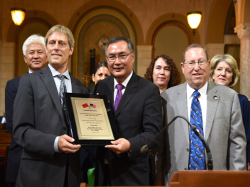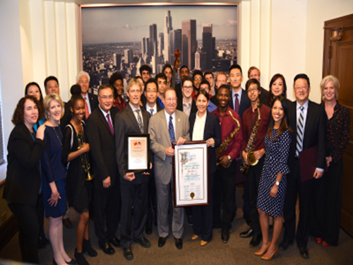 随后在洛杉矶市议会大厅,在全体市议员见证下,张总领事向汉米尔顿高中爵士乐团赠授了纪念牌匾。乐团现场表演了精彩曲目。