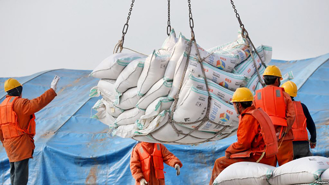 2018年3月22日,中国江苏省南通港口工人装卸进口的大豆产品。中国4月3日宣布将对包括大豆在内的价值500亿美元的美国商品加征关税,报复川普政府前一日公布的对中国商品增收关税清单。