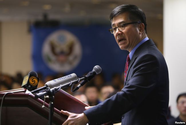 2014年2月26日,美国驻华大使骆家辉在北京的美国中心发表告别讲话。