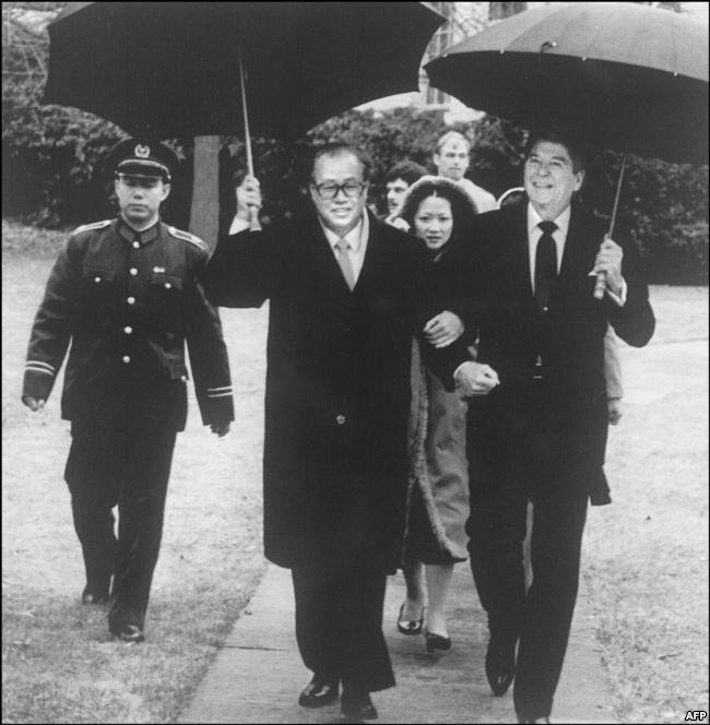 1984年10月1日在白宫会见后,在雨中,美国总统罗纳德·里根和中国总理赵紫阳挽着臂膀,送赵紫阳走向他的汽车。