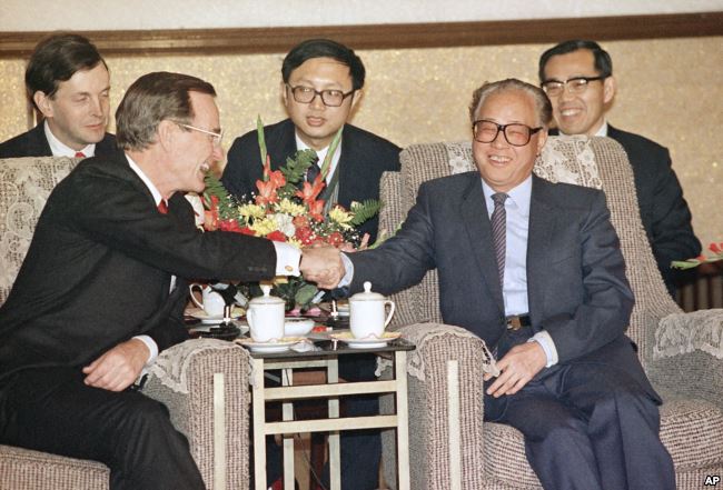 1989年2月26日,美国总统乔治·H·W·布什和中共总书记兼国务院总理赵紫阳在北京人民大会堂举行会谈时握手。
