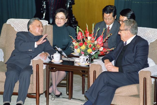1989年11月10日,中国领导人邓小平和美国前国务卿基辛格在北京人民大会堂交谈。