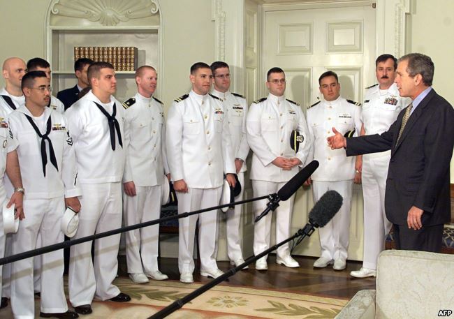 2001年5月18日美国总统乔治·W·布什与美国海军EP-3飞机的机组人员会面,他们的飞机在4月1日与中国战斗机相撞后被扣留在中国。