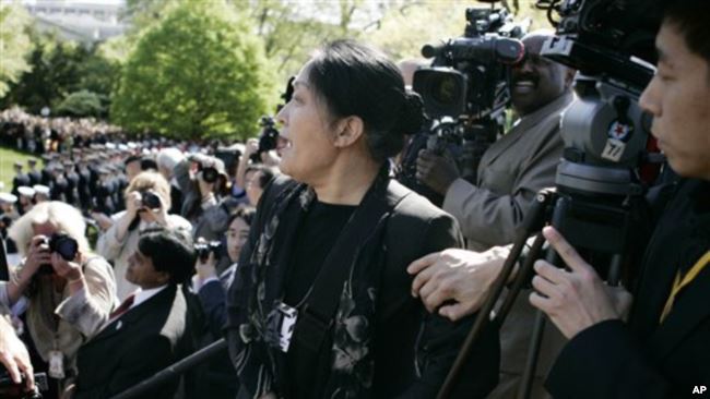 2006年4月20日,《大纪元》记者、法轮功修炼者王文怡在中国国家主席胡锦涛与布什总统在白宫南草坪会晤仪式上,从摄影人员站台上大声喊话。