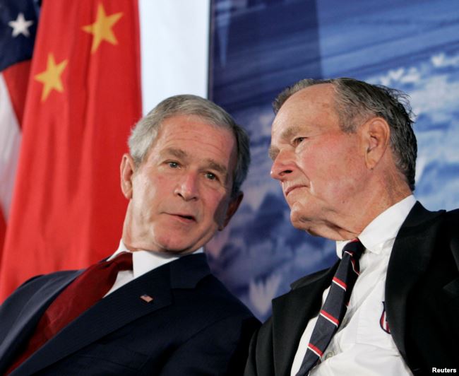 2008年8月美国总统乔治·W·布什与他的父亲,前美国总统老布什在北京参加了美国驻北京大使馆新馆的开馆仪式。