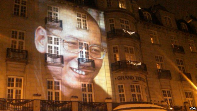 2010年12月10日,为刘晓波缺席颁发诺贝尔和平奖之夜,他的形象投映在举行诺和奖晚宴的奥斯陆大酒店的正面外墙。
