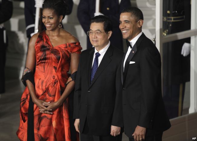 2011年1月美国总统奥巴马和夫人与中国主席胡锦涛出席白宫晚宴。