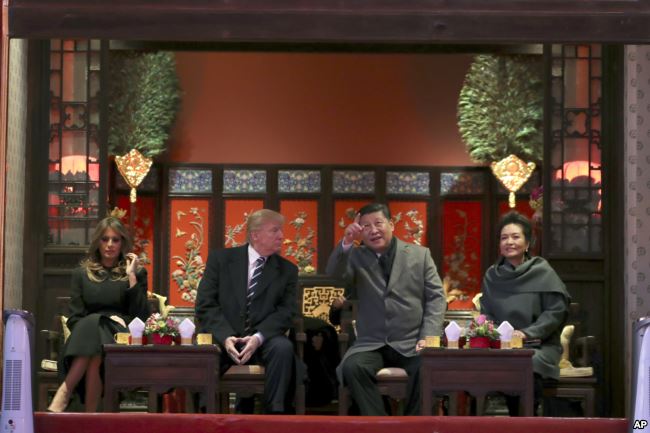 美国总统特朗普(中左)和第一夫人梅拉尼亚(左)与中国国家主席习近平(中右)与夫人彭丽媛(右)在北京故宫观看京剧。 (2017年11月8日)