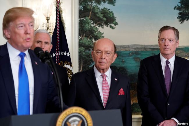在签署因知识产权盗窃问题而对中国高科技产品征收关税的总统备忘录前,美国总统特朗普在副总统彭斯、美国商务部长罗斯和美国贸易代表莱特希泽陪同下在白宫讲话。(2018年3月22日)