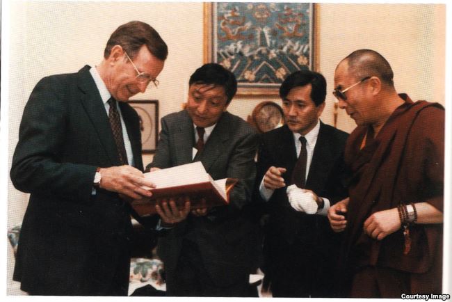 1991年4月16日,乔治·H·W·布什总统在白宫私人住所以“私人身份”会晤流亡西藏精神领袖、1989年诺贝尔和平奖得主达赖喇嘛,这是美国国家元首第一次会晤达赖喇嘛。