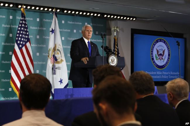 彭斯副总统在哈德逊研究所就美国政府的中国政策问题发表演说。(2018年10月4日)