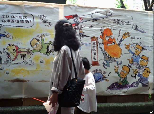 1996年3月23日,台北一个市场上的漫画。左侧漫画上有江泽民。右侧漫画上,台湾总统李登辉(右)安抚他的竞争对手说,他有18套办法对付中国导弹。