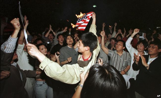1999年5月8日,在北约误炸中国驻南斯拉夫大使馆之后,北京学生在美国使馆外面焚烧美国国旗