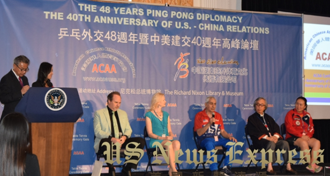 美国华人体育家协会4月10日在加利福尼亚州约巴林达市尼克松图书馆和博物馆举行纪念中美“乒乓外交”48周年活动。中美两国体育界人士、南加州侨界代表以及中美两国官员200多人参加了此次活动。