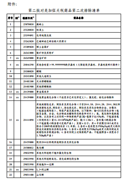 根据《国务院关税税则委员会关于试行开展对美加征关税商品排除工作的公告》(税委会公告〔2019〕2号),经国务院批准,中国国务院关税税则委员会公布第二批对美加征关税商品第二次排除清单,对第二批对美加征关税商品,第二次排除其中部分商品,自2020年5月19日至2021年5月18日,不再加征中国为反制美301措施所加征的关税。对已加征的关税税款予以退还,相关进口企业应自排除清单公布之日起6个月内按规定向海关申请办理。第二批对美加征关税的其余商品,暂不予排除。