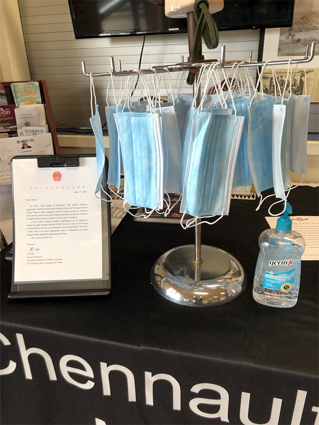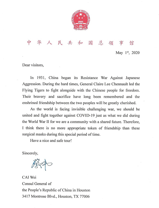 近日,我馆向美国陈纳德将军基金会捐赠了一批医用口罩,帮助当地人民抗击新冠肺炎疫情。基金会将这些放置于陈纳德飞行博物馆中供免费领取,并公开展示了蔡伟总领事致参观者的一封信。