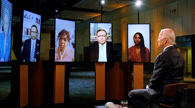 图为民主党总统候选人乔·拜登在民主党全国代表大会上与其他参议员就种族歧视问题展开视频讨论。(图片来源:美联社)