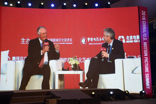 峰会执行主席迪克·库克(左)与第86届奥斯卡最佳导演奖获得者阿方索·卡隆对话 2016中美电影产业峰会旨在深入探索中美电影产业的新型合作模式,促进电影产业升级。峰会分为“电影叙事的艺术:如何讲好中国的故事”、“动画世界:呈现大银幕的梦幻奇迹”、“中国电影产业的未来:中美合作新定义”、“中美影视教育高端对话:如何培养新生代电影人”、“幕后制片策略谈:如何让中国电影走出去”、“电影技术的变革对未来电影制作和发行的影响”等多个主题版块,围绕电影创意、叙事艺术、创意合拍战略、新技术对制片与观影的影响以及中美电影合作未来发展趋势等话题展开探讨,并举办了沉浸式电影顶尖新技术体验展览,为中美企业和投资者搭建起在电影投融资、制片、宣发、衍生开发等多领域对话和探寻合作的高端平台。 峰会的主办方中国新闻文化促进会是国家新闻出版广电总局与新闻界文化界联系的桥梁和纽带,也是新闻界文化界融合发展的重要平台,会员单位覆盖新闻出版广播电影电视网络等文化产业链的各重要组成部分,在传媒界具有重要影响力;中国电影家协会是中国政府联系电影界的重要桥梁和纽带,是繁荣发展中国电影的重要力量;北京电影学院是中国电影人才的摇篮,也是世界著名的电影艺术高等学府,在电影界享有盛誉。承办方中信国安投资有限公司拥有强大的品牌优势和综合实力,以弘扬中华优秀传统文化为己任,助推中国电影走向世界;美国DCS影业公司是由迪士尼影业公司董事局原主席迪克·库克创办的致力于合家欢类型影视娱乐产品制作、宣传和发行的大型影视公司。 主办方与承办方表示,希望将峰会努力打造成为中国电影产业专业领域最具实战性、专业性、权威性的永久性品牌峰会,用国际声音讲好中国故事,向世界展现中国优秀文化。
