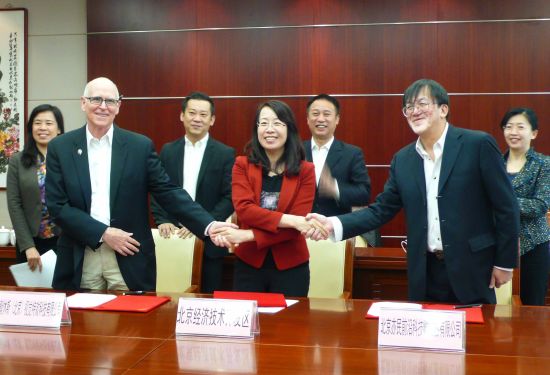 好莱坞影视后期制作的领军人物约翰•帕特里克•休斯(左一)19日与北京经济经济技术开发区管委会签署入区协议,以其名字命名的约翰休斯(北京)视觉特效科技有限公司、约翰休斯影视与视觉艺术中心正式落户北京亦庄。